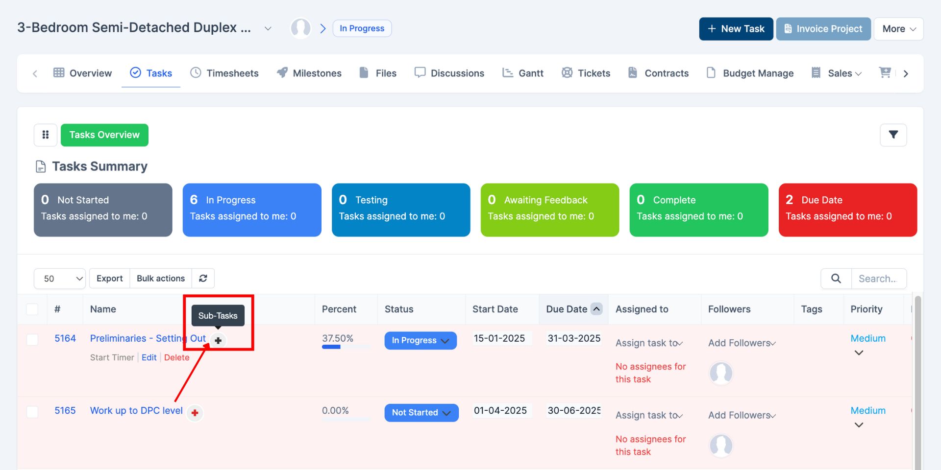 Milestones represent major phases or deliverables within a project. In real estate development projects, milestones often reflect stages such as Foundation Works, Superstructure, Roofing, Finishing, and Handover. Creating milestones ensures that tasks are aligned with key project phases.