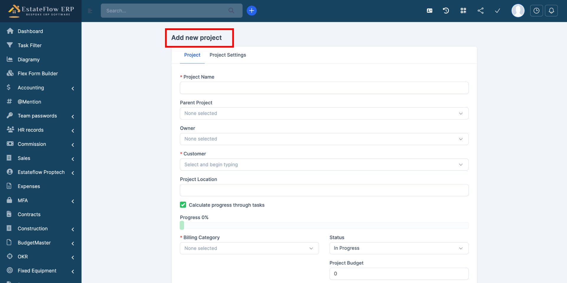 Ensure the Construction Orchestrator module is enabled in EstateFlow ERP.