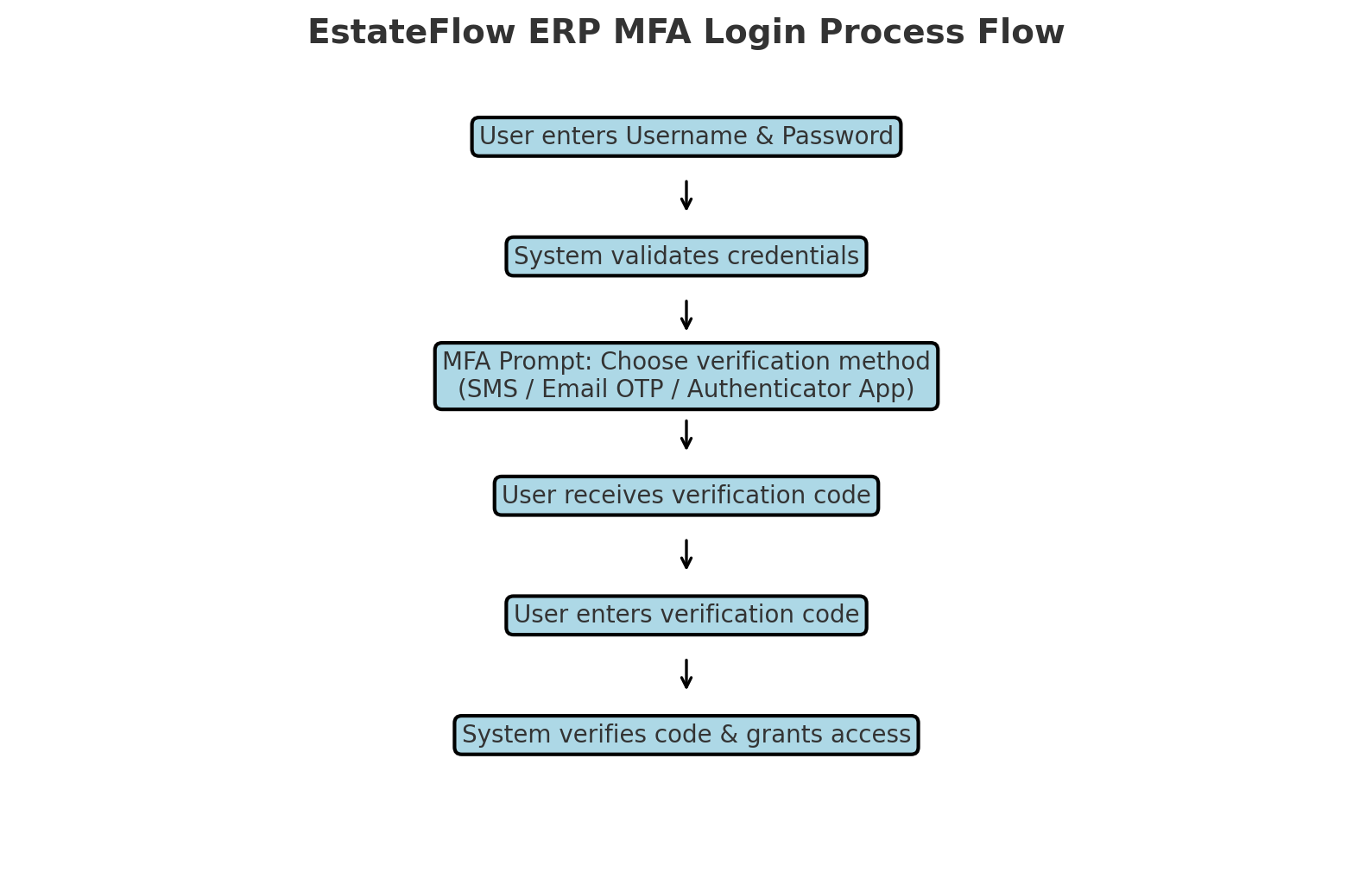The Multi-Factor Authentication (MFA) module in EstateFlow ERP provides an added layer of security to protect sensitive company and project data. MFA requires users to verify their identity through more than one method — typically a password plus a time-sensitive authentication code. This is especially important in real estate development environments where ERP systems manage financial data, vendor contracts, and confidential project documentation.